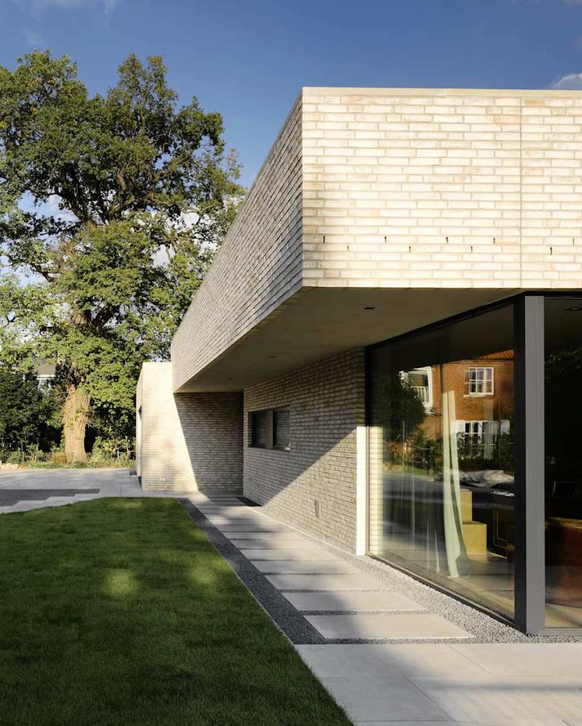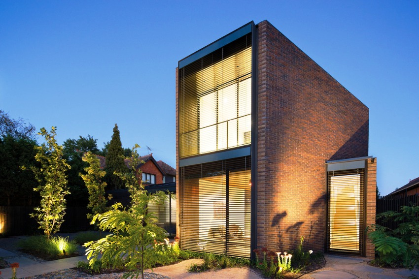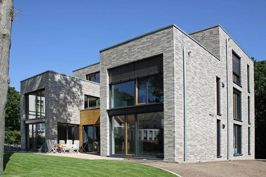 Pemasangan bangunan sedemikian memungkinkan untuk menentukan kelebihan jelas batu bata dan batu. Gambar rumah dari bahan-bahan ini mengesahkan fakta ini. Dalam pembinaan rumah minimalis, jenis bata khas digunakan - klinker.Bata ini dibuat dari jenis tanah liat khas. Sebaiknya pilih warna seramik dalam warna neutral (putih, hitam).