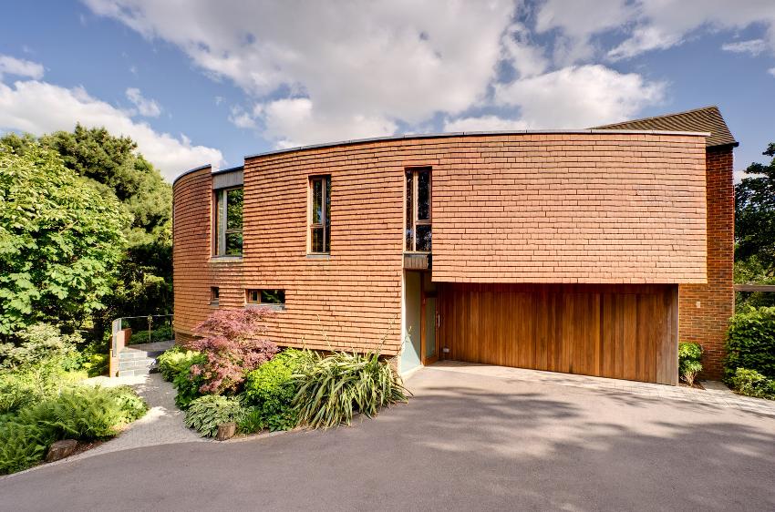 Tingkap melengkung sering dibuat di struktur ini. Bingkai tingkap boleh mempunyai bentuk yang kompleks. Selain itu, tingkap kaca berwarna adalah pilihan reka bentuk yang cukup popular untuk elemen struktur ini. Batu bata hiasan sering digunakan dalam pelapisan rumah. Foto projek siap membolehkan anda menentukan kelebihan dan kekurangan gaya moden.
