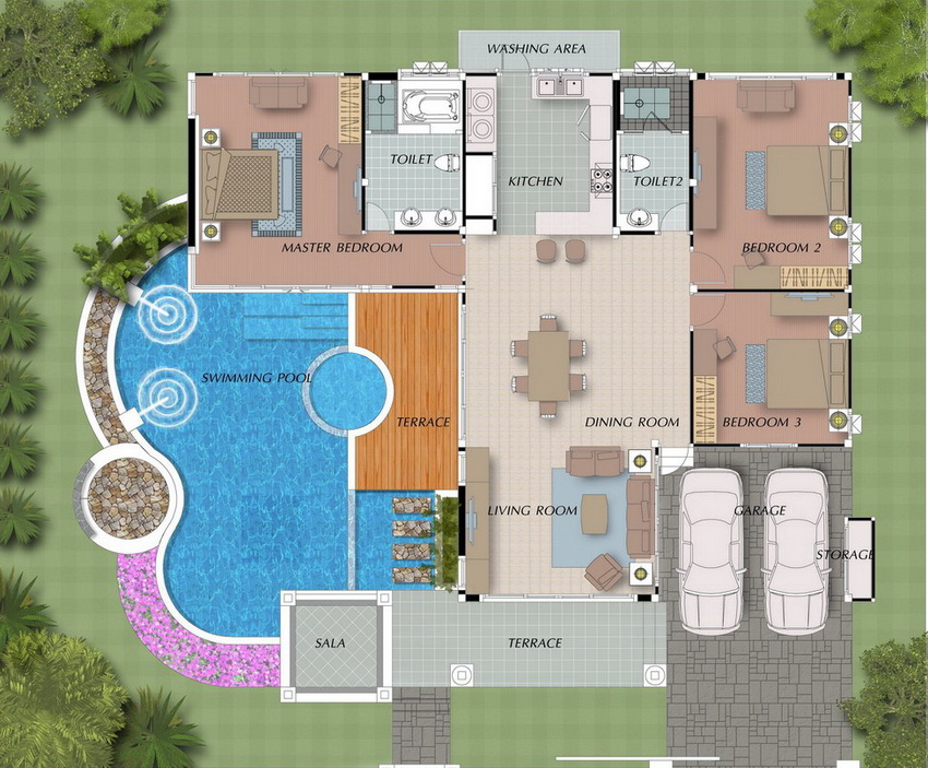 Pengenalan kawasan fungsional ke dalam projek rumah desa dan pondok yang indah