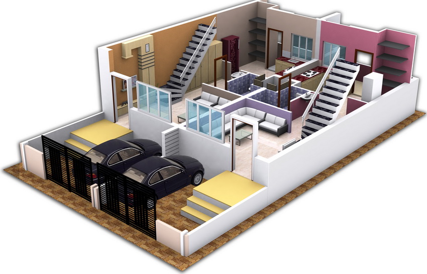 Ruang tamu seperti ini biasanya mempunyai dua pintu masuk: di tingkat pertama dan kedua. Tangga digunakan untuk mendaki. Reka bentuknya boleh berarak, skru atau hiasan.