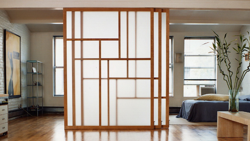 Di bahagian dalam bilik tidur, skrin boleh digunakan sebagai partisi yang memisahkan kawasan tempat tidur dari meja tulis atau kawasan ganti.