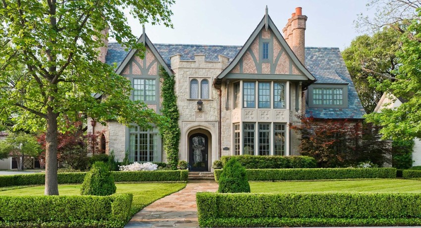 Rumah dalam gaya Inggeris. Ciri-ciri seni bina era yang berbeza. Gaya klasik moden. Rumah satu tingkat, pondok. Hiasan fasad. Reka bentuk landskap Inggeris.