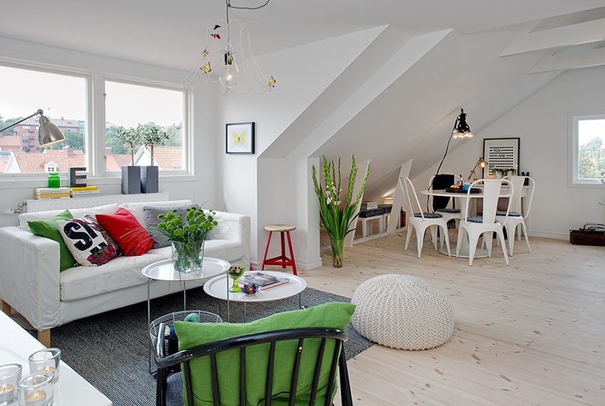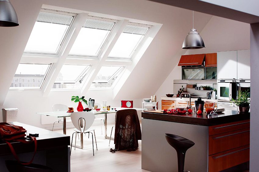 - pencahayaan semula jadi di loteng adalah aspek keselesaan yang sangat penting. Tetapi ia boleh dilanggar jika ada musim sejuk bersalji di luar tingkap. Pencahayaan semula jadi menghalang pertumbuhan mikroba dan mempunyai kesan yang baik terhadap penglihatan, oleh itu sangat penting untuk memastikan akses cahaya matahari yang tidak terganggu ke dalam bilik.