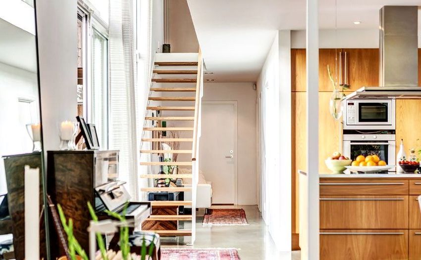 Lebih baik meletakkan tangga berhampiran lorong dan memisahkannya dengan partition. Oleh itu, orang yang menaiki atau menuruni tangga tidak akan mengganggu siapa pun, dan mungkin untuk mewujudkan suasana terpencil dan selesa di ruang tamu.