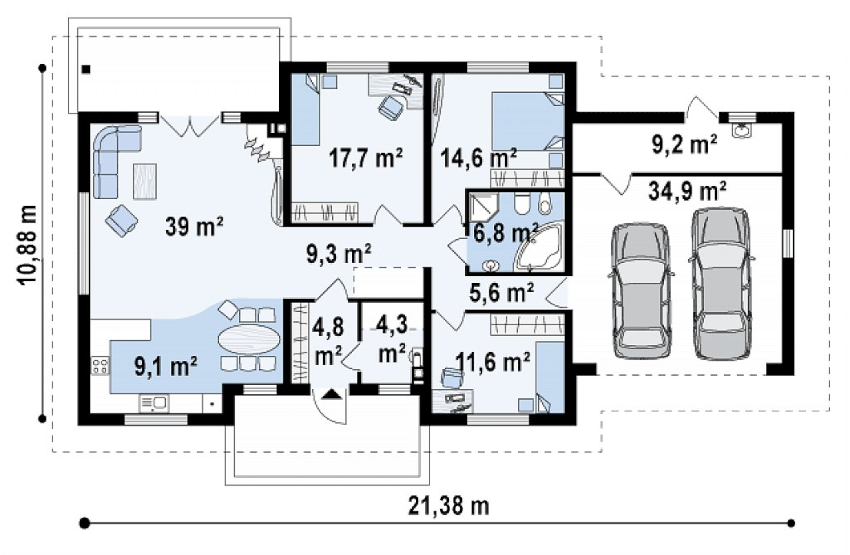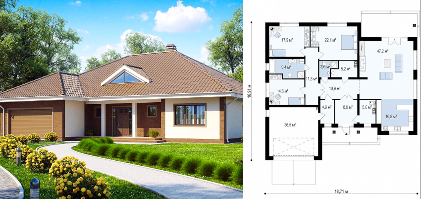 Projek rumah satu tingkat dari blok busa dengan susun atur: dari asas hingga bumbung