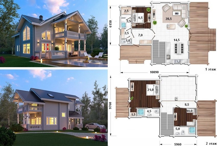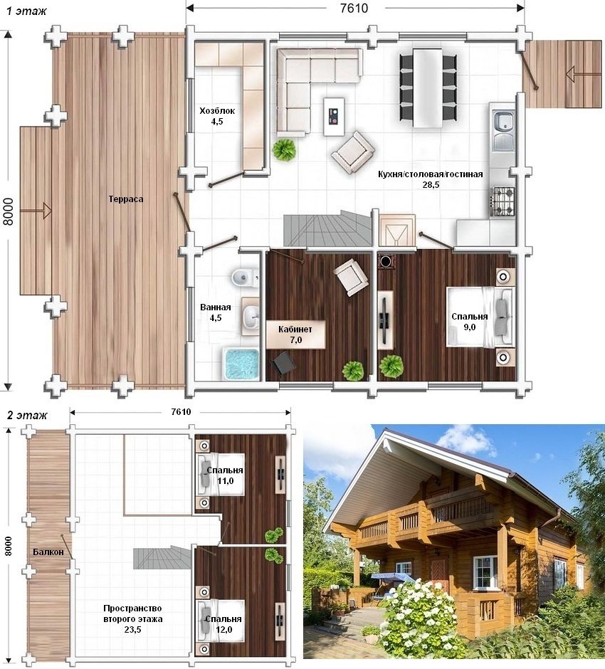 Di antara cadangan yang dimasukkan dalam katalog pondok, projek khas rumah kayu 6 hingga 9 untuk kediaman tetap cukup popular. Projek ini telah melaksanakan skema perancangan yang berjaya yang menggabungkan semua bilik yang diperlukan: ruang tamu, bilik tidur, dapur, bilik mandi dan koridor yang luas di kedua-dua tingkat. Anda boleh membuat penyesuaian individu terhadap pelan lantai siap tanpa meningkatkan kos projek.