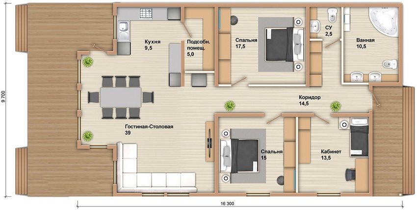 Ketinggian tingkat pertama rumah satu tingkat adalah, biasanya, 2,7 m. Pakej ini merangkumi partisi, lantai dan balok siling yang diperbuat daripada kayu 150x150 mm, siling dan lantai yang diperbuat daripada papan 22x100 mm dalam reka bentuk kasar.Serta pelat dan pelat atap yang terbuat dari papan, atap dirasakan, kalis air pondasi dan pemprosesan kayu balak, lantai dan pelat dengan sebatian antiseptik.