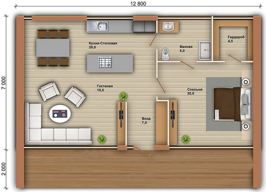 Pondok satu tingkat tidak mempunyai tangga, yang merangkumi sebahagian dari kawasan yang boleh digunakan. Fakta ini membolehkan anda memperuntukkan ruang secara optimum untuk ruang tamu dan bilik utiliti. Pendawaian semua komunikasi di rumah seperti ini mempunyai skema yang dipermudahkan, yang menyumbang kepada penjimatan tenaga yang ketara semasa musim pemanasan. Rumah ini sangat sesuai untuk keluarga kecil.