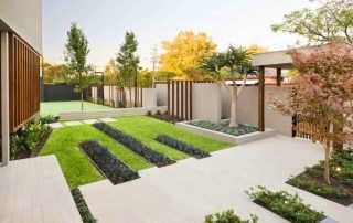 Reka bentuk halaman rumah persendirian. Foto halaman moden, dihiasi mengikut peraturan pengezonan. Susunan platform, laluan, pemasangan elemen hiasan.