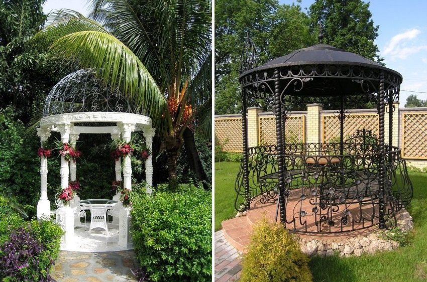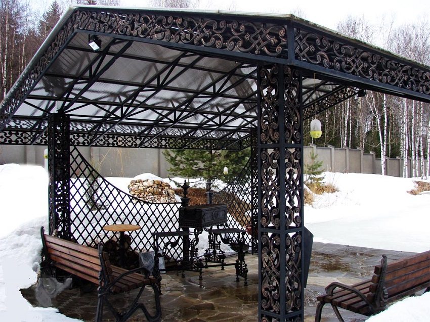 Gazebo logam agak biasa di bahagian luar pinggir bandar. Struktur yang dibina dari profil logam mempunyai penampilan terbuka yang ringan, walaupun ia cukup kuat dan tahan lama. Gazebo seperti ini dapat berfungsi selama beberapa dekad. Walau bagaimanapun, pembinaan struktur logam memerlukan mesin kimpalan dan beberapa pengalaman dengannya.