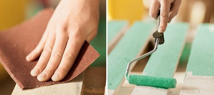 Semasa melukis, anda boleh menggunakan cat akrilik. Dengan pertolongan mereka, setiap lukisan atau corak yang anda suka disisipkan pada dinding. Reka bentuk yang dicat putih kelihatan sangat elegan dan elegan. Sekiranya gaya melibatkan meninggalkan warna semula jadi, permukaan kayu palet dipernis dalam beberapa lapisan. Untuk lantai, sebatian pelindung digunakan untuk mencegah kerosakan bahan pramatang.