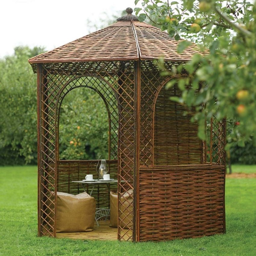 Sebuah gazebo, pagarnya dibuat dalam bentuk pagar wattle, boleh berehat. Untuk rak pagar seperti itu, tiang atau batang digunakan, dan untuk mengikat - pucuk hazel, willow atau birch. Foto gazebo kayu untuk kediaman musim panas akan memberi inspirasi kepada anda untuk membuat reka bentuk individu anda sendiri di taman.