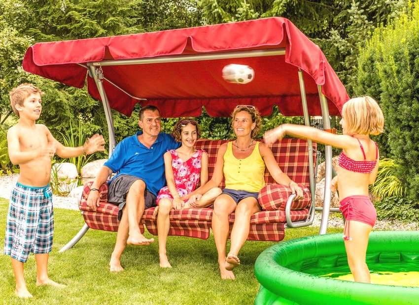 - keluarga - produk dengan pembinaan yang besar dan berat. Dengan struktur mereka, mereka menyerupai bangku tanpa kaki dengan punggung yang besar dan tinggi. Oleh kerana dimensi yang besar, seisi keluarga dapat duduk di tempat duduk. Untuk menjadikan operasi ayunan itu selamat, mereka dipasang dengan selamat pada bingkai berbentuk U. Kabel kuat atau rantai tebal digunakan sebagai kunci. Sekiranya anda mengatur bumbung atau tenda di atas buaian, ia boleh digunakan walaupun dalam hujan;