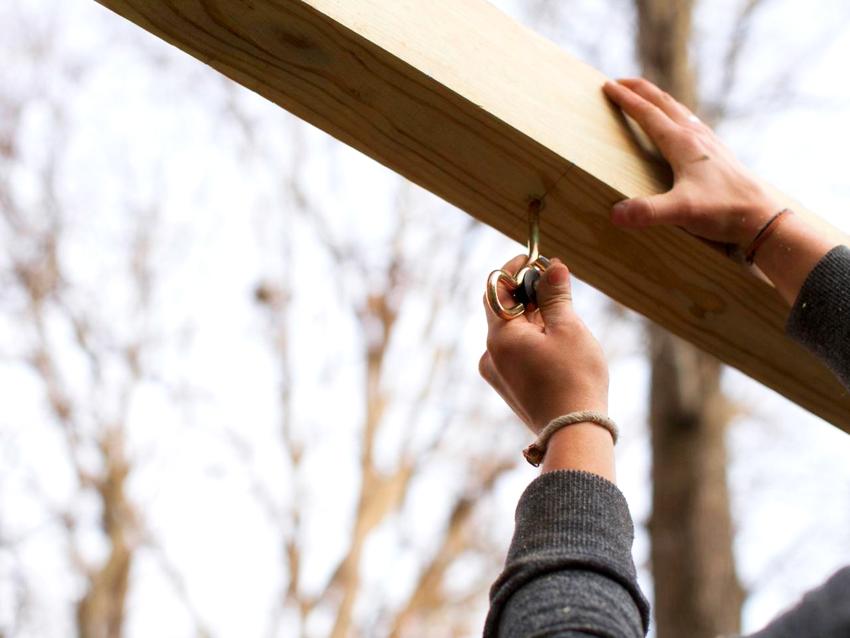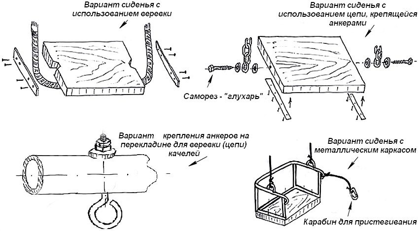 Untuk memasang tali atau rantai ke tempat duduk, pendakap atau cangkuk khas dipasang. Ini akan membolehkan struktur digantung dari palang.