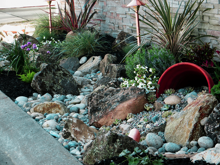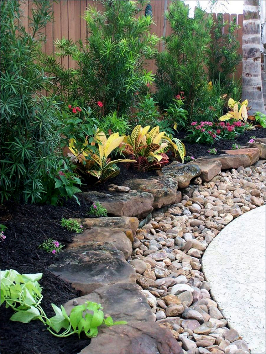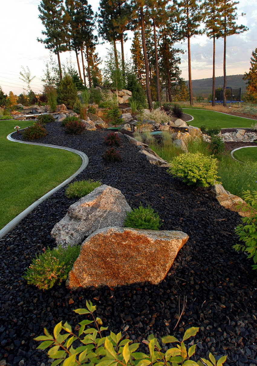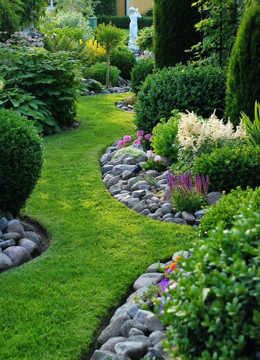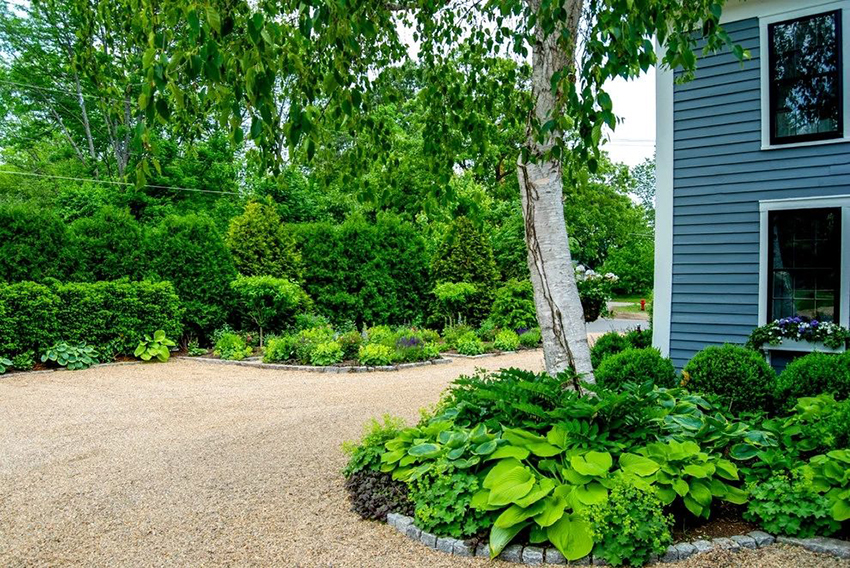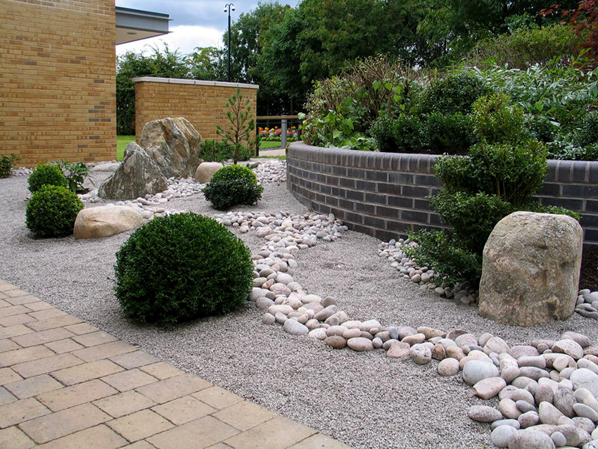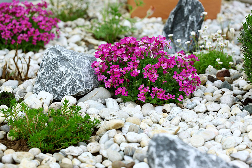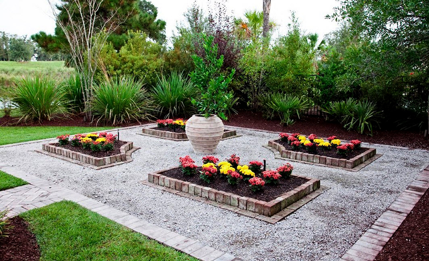 Kerikil banyak digunakan dalam hiasan taman. Penampilan yang rapi, pilihan warna yang besar dan kos rendah bukan sahaja memungkinkan untuk melindungi taman bunga, tetapi juga menjadikannya karya seni yang sebenar. Selalunya, batu kerikil digunakan untuk membuat garis besar tempat tidur bunga. Untuk memberikan kekuatan pada struktur, bahan biasanya diletakkan di atas mortar simen.