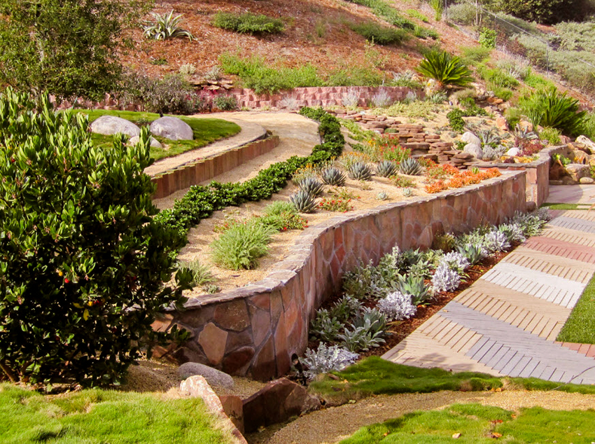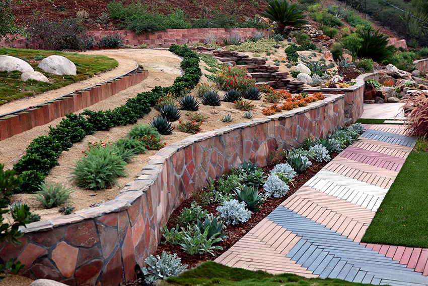 Lereng bertingkat dibangun dari dinding dengan berbagai bentuk dan ketinggian, terbuat dari batu hancur (kuarza, granit, basalt), kadang-kadang dengan penambahan batu pasir atau batu kapur.