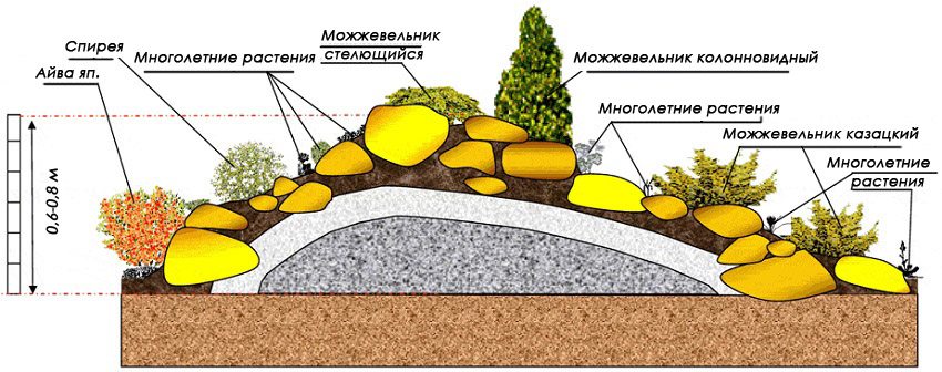 Rockery, atau bukit berbatu, adalah sekumpulan batu besar dengan ukuran yang berbeza, tersebar dengan indah di kawasan kecil, tetapi mempunyai keturunan yang sama (paling sering, batu tulis atau batu kapur). Ini dilakukan untuk mensimulasikan padang rumput gunung. Batu-batu besar untuk tempat tidur bunga digali ke tanah di tanah untuk kestabilan yang lebih besar, dan kerikil kecil tersebar di dekatnya. Dengan latar belakang ini, pokok renek dan tanaman merambat (heather, juniper, dwarf spruce, thuja, sedum, miscanthus) kelihatan sangat sesuai.