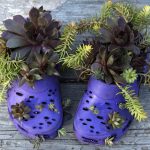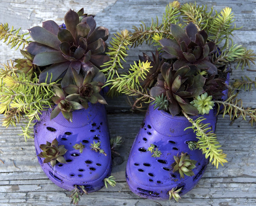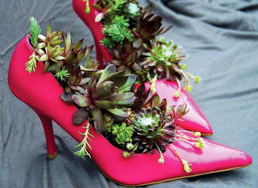 Bunga yang ditanam di kasut lama kelihatan sangat asli. Lebih-lebih lagi, semakin besar saiz kasut, lebih menarik ia dapat direka bentuk. Buat pasu bunga mudah dari kasut yang usang: anda perlu membuat beberapa lubang pada sol, yang akan membantu melengkapkan sistem saliran. Selepas itu, bahagian dalam kasut dipenuhi dengan tanah dan bunga ditanam di dalamnya.