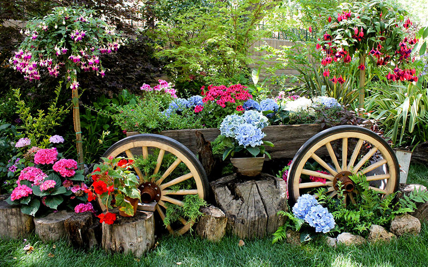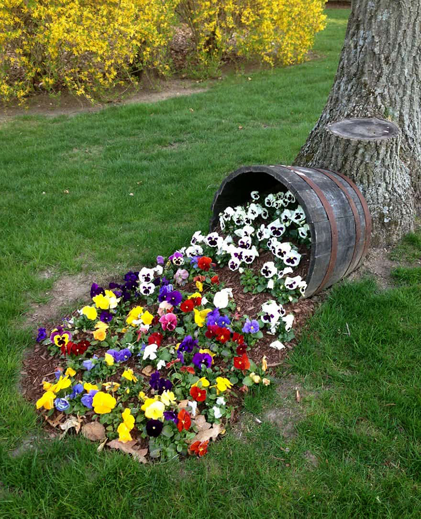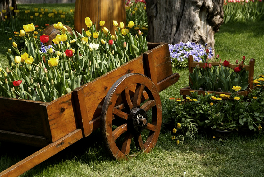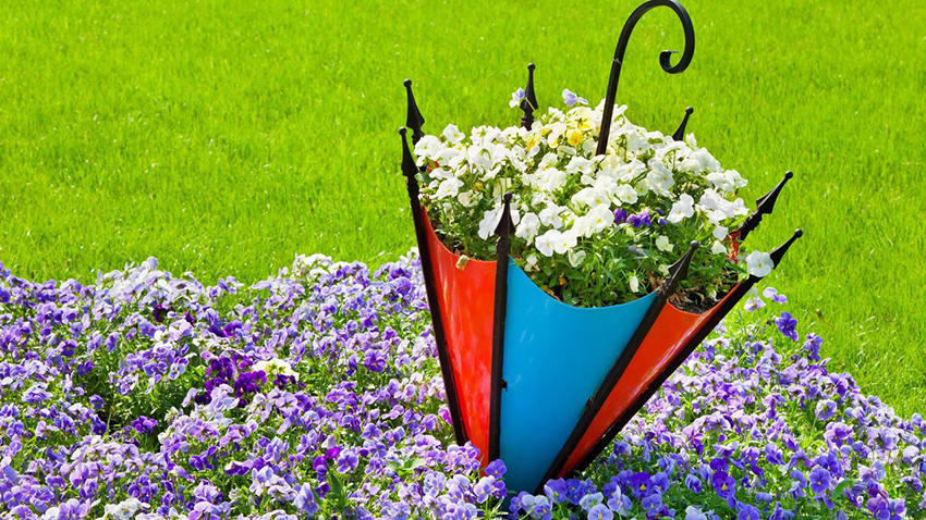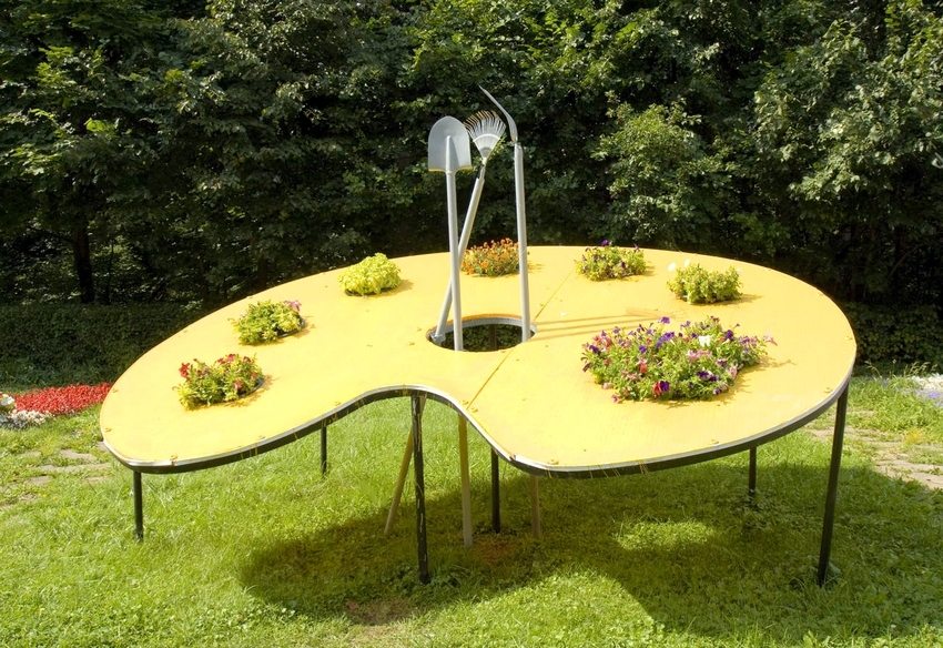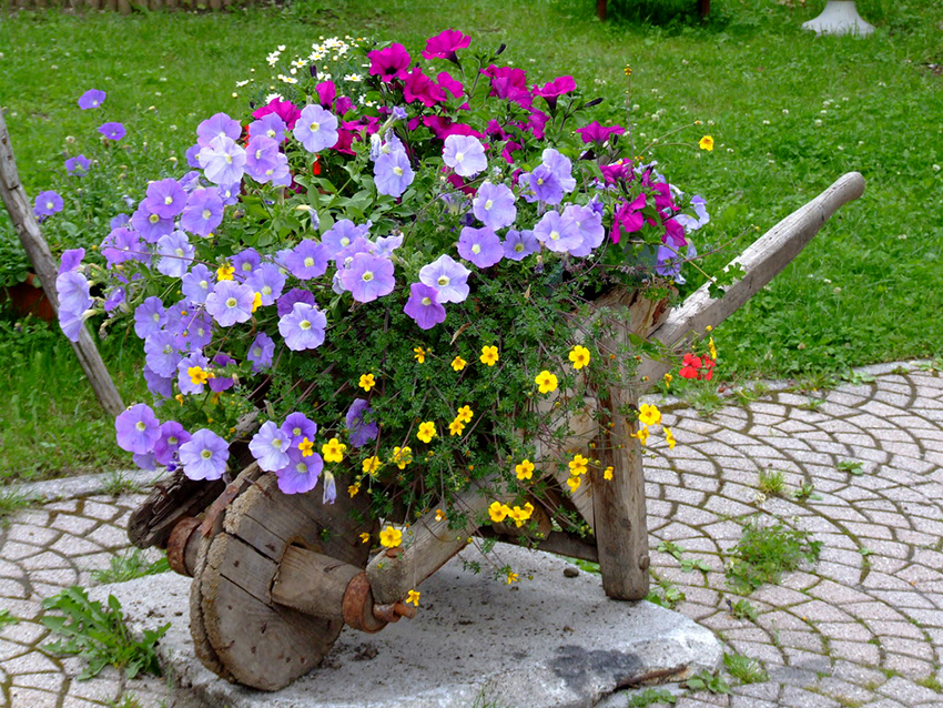 Penyelesaian yang sangat baik untuk taman bunga seperti itu adalah periuk dengan petunias, nasturtium atau biola. Dan jangan lupa untuk melengkapkan komposisi dengan garu dan sekop, kerana ini adalah alat-alat seniman tukang kebun, yang dengannya dia "menarik" dunia di sekelilingnya.