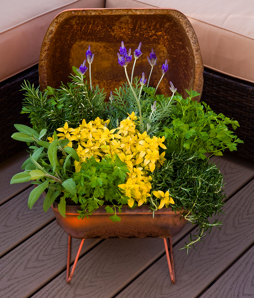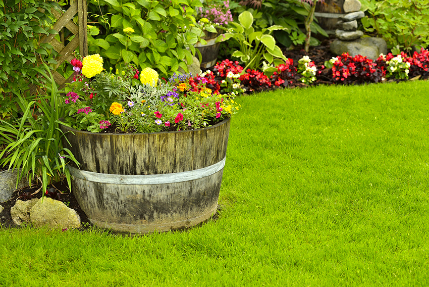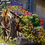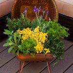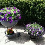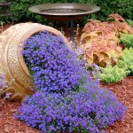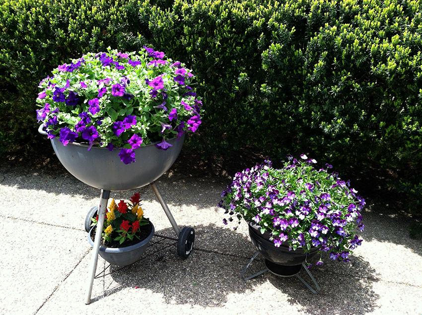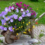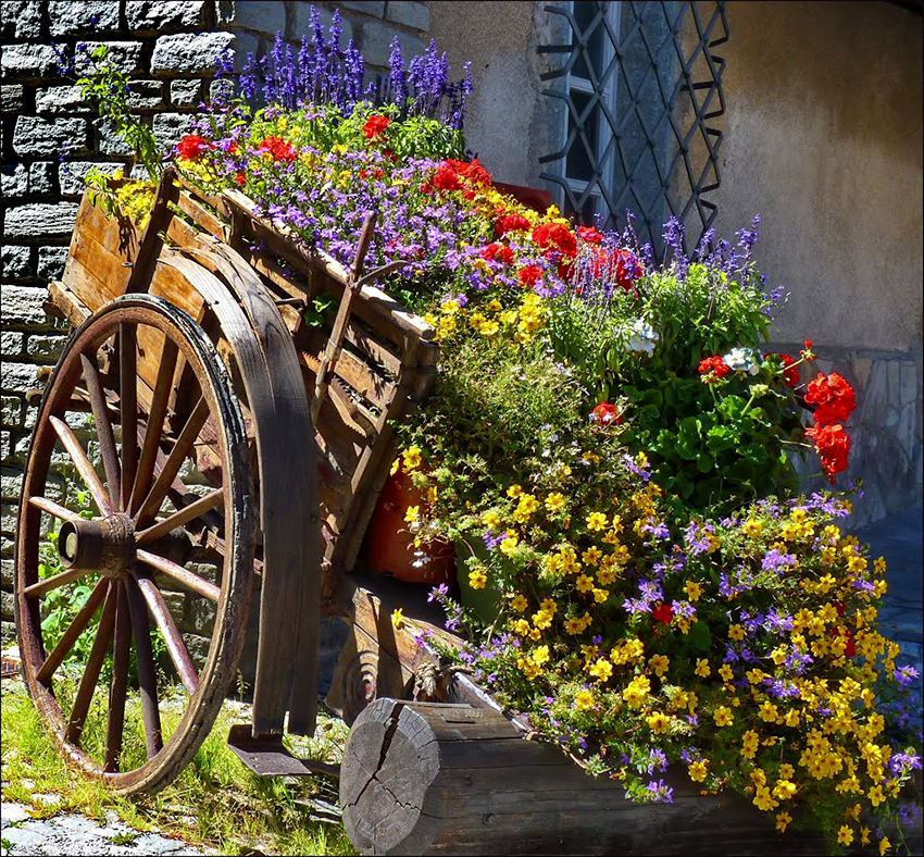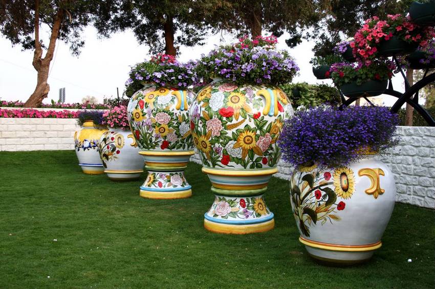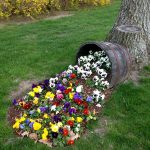 Penyelesaian yang sangat baik untuk taman bunga seperti itu adalah periuk dengan petunias, nasturtium atau biola. Dan jangan lupa untuk melengkapkan komposisi dengan garu dan sekop, kerana ini adalah alat-alat seniman tukang kebun, yang dengannya dia "menarik" dunia di sekelilingnya.