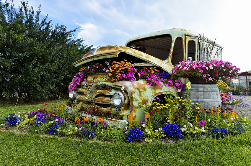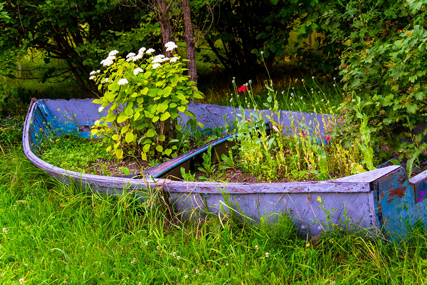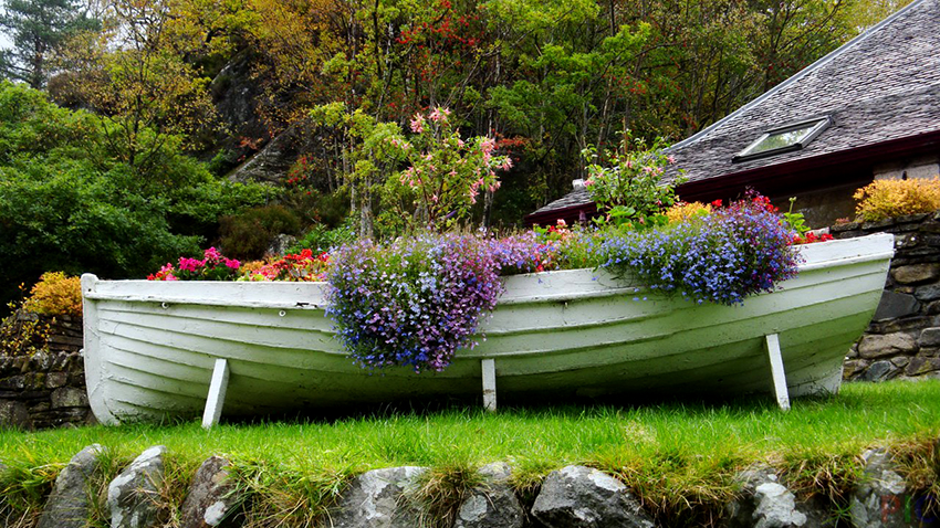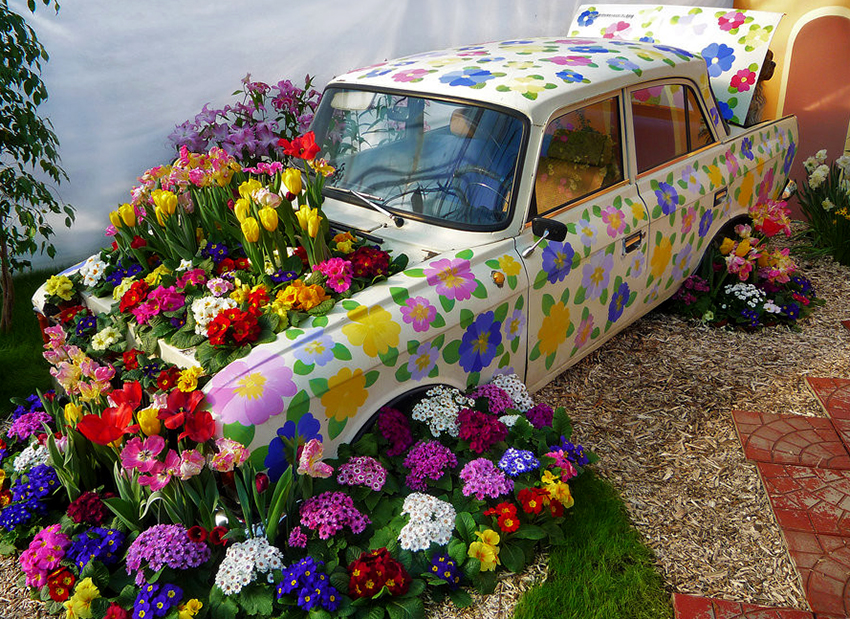 Sekiranya menggunakan kapal atau kereta lama, tempat tidur bunga akan menjadi tidak bergerak, tetapi pada masa yang sama lebih besar. Perahu sangat sesuai untuk membuat penanam hiasan. Untuk melakukan ini, cukup untuk memperbaikinya di tanah dan mengisinya dengan tanah. Gunakan prinsip yang sama untuk kereta anda. Keluarkan semua bahagian yang tidak diperlukan daripadanya: tempat duduk, enjin, bagasi dan penutup tudung. Kemudian anda boleh mula menghias dengan bunga.