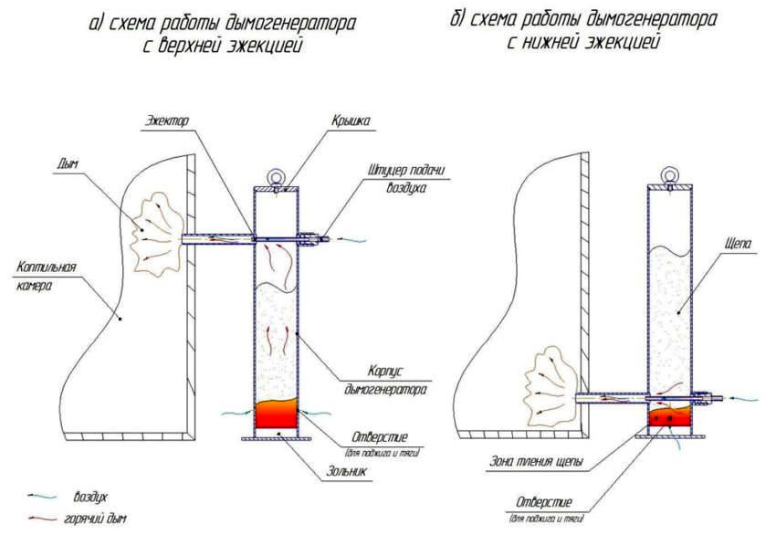 Penggunaan peranti ini membolehkan anda memberikan daya tarikan yang diperlukan di dalam unit merokok. Dalam kes ini, tujahan disuntik secara artifisial (berbanding dengan struktur berbaris). Penjana asap memastikan aliran asap tanpa gangguan yang diperlukan untuk proses merokok sejuk ke dalam ruang.