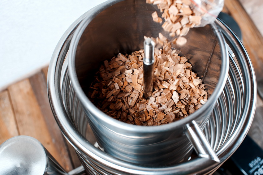Untuk menyalakan gudang asap, tuangkan serpihan kayu ke dalam penghasil asap dan biarkan sehingga membara di dalamnya