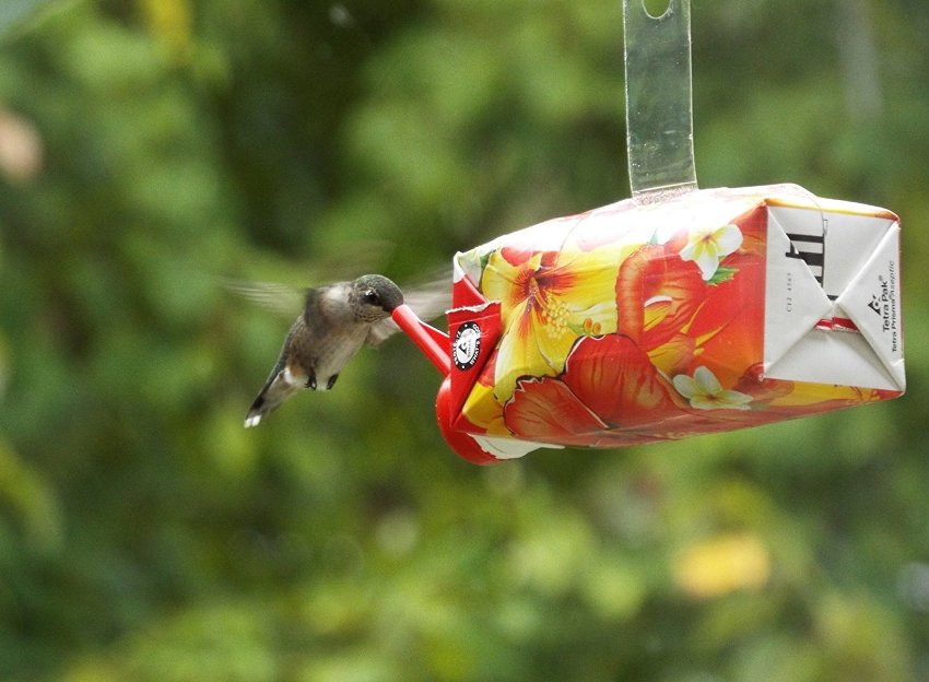 Kemudian lubang berbentuk U dipotong dalam bentuk terbalik. Bahagian atas harus dilipat ke belakang untuk membentuk kanopi hujan. Bahagian bawah bukaan ditutup dengan plaster pelekat supaya burung tidak terluka semasa memberi makan.