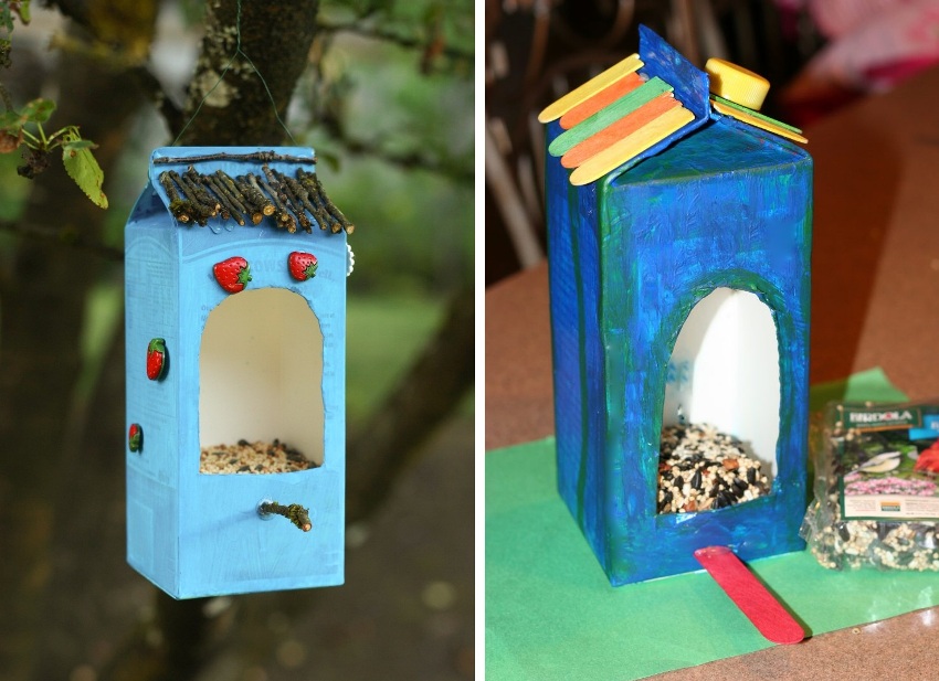 Anda boleh menemui banyak idea menarik untuk menghias pengumpan buatan sendiri di internet. Sekiranya anda menangani masalah ini secara menyeluruh, anda boleh membuat rumah dengan bentuk yang tidak biasa. Selepas itu, cat yang tinggal setelah pembaikan, pelbagai angka dan kertas berwarna digunakan untuk hiasan.Namun, jangan keterlaluan dengan perincian gemerisik dan berkilat, jika tidak, burung akan ketakutan. Di samping itu, elemen hiasan tidak boleh menimbulkan halangan untuk pengambilan makanan.