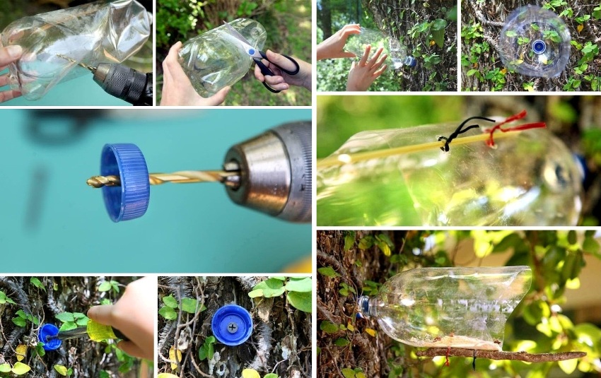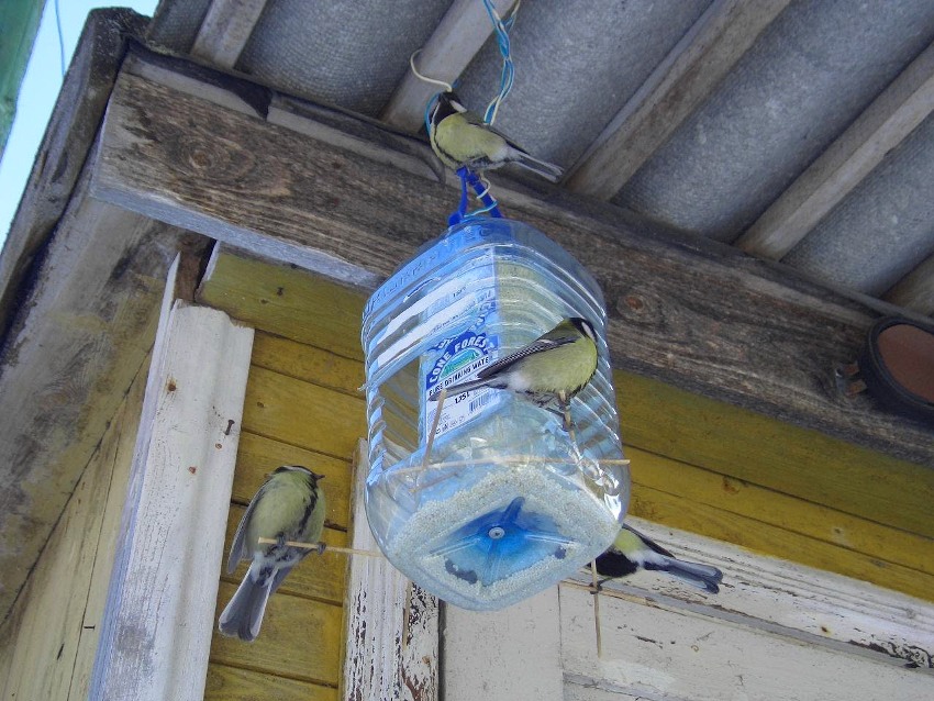 Botol yang sesuai mesti diisi dengan campuran makanan, diskrukan pada penutup dan diletakkan di dalam bekas, yang dipotong 1/3. Selepas itu, benang ditarik melalui lubang, dan strukturnya digantung dari sebatang pokok.