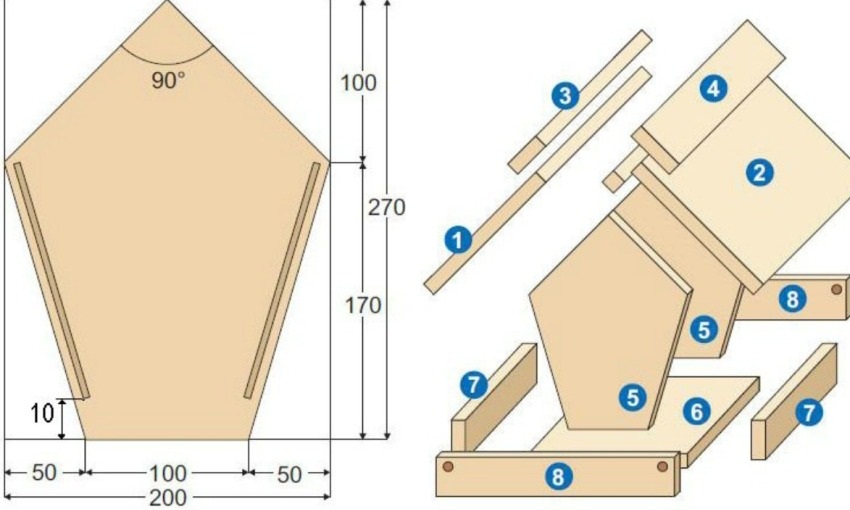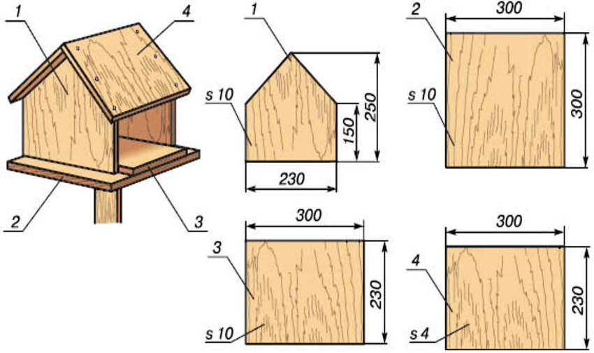 Sesuai dengan gambar, penanda dilekatkan pada kepingan papan lapis. Kemudian semua bahagian dipotong dengan berhati-hati dengan jigsaw. Sebagai lantai untuk bahagian bawah, elemen persegi 25x25 cm akan digunakan. Untuk membina bumbung, anda perlu mengambil bahagian yang lebih besar, jika tidak, kelembapan akan mengalir ke dalam umpan. Tepi kosong yang dihasilkan mesti diampelas.