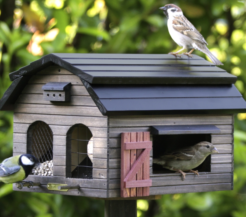 Burung pipit sangat berhati-hati. Sekiranya ada bahaya, mereka terbang terus dari tempat kejadian. Oleh itu, pilihan terbaik adalah rumah burung diperbuat daripada kadbod atau kayu dengan bumbung curam dengan lebih banyak gantungan. Adalah wajar struktur ini mempunyai tingkap rendah yang menyediakan akses kepada makanan kepada burung. Dalam kes ini, burung pipit terlebih dahulu harus melayang ke sisi sebelum terbang jauh, jadi pengumpan seperti itu tidak menarik bagi mereka.