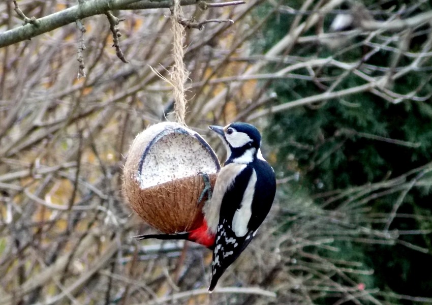 Pengumpan burung gantung boleh dibuat untuk jenis burung tertentu. Tetek hebat lebih suka kalungan yang dibuat dari beri kering. Mereka terutamanya menyukai pinggul mawar. Penggunaan kacang dalam kacang dibenarkan.