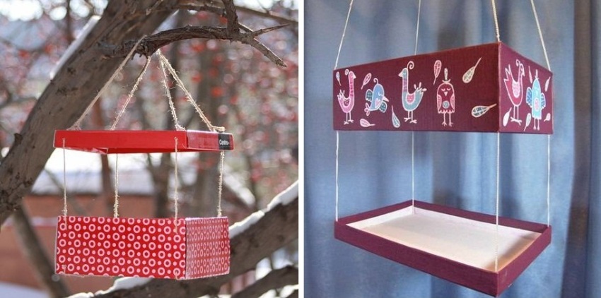 Pemakan burung buatan sendiri boleh dibuat dari bahan paling mudah di tangan. Hampir setiap rumah mengandungi kotak makanan, kasut atau peralatan elektrik. Untuk kerja, disarankan untuk memilih kadbod tebal. Pilihan yang ideal adalah pemakan burung dari kotak dengan penutup berlapis, yang akan meningkatkan umur struktur.
