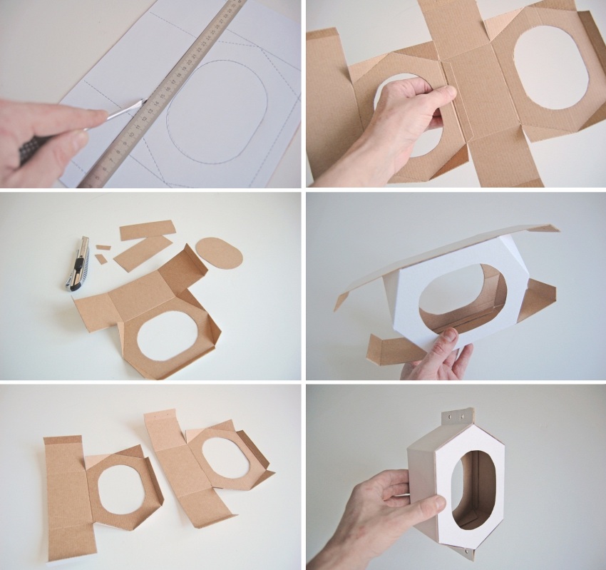Pengumpan harus selesa bagi burung, jadi tanda pada kadbod dan beberapa lubang dengan ukuran yang cukup dipotong pada sisi yang berlawanan. Kawasan lapang akan membolehkan burung bergerak dan mengambil makanan dengan mudah. Atas sebab keselamatan, tingkap mesti ditampal dengan pelekat.