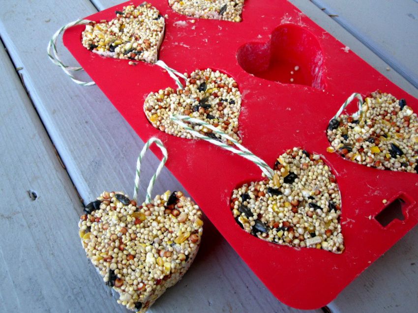 Selepas pengerasan, pengumpan siap sepenuhnya untuk digunakan. Untuk memudahkan burung untuk mencengkam, acuan boleh diletakkan di dalam beg mesh yang terang.