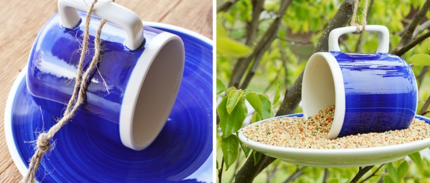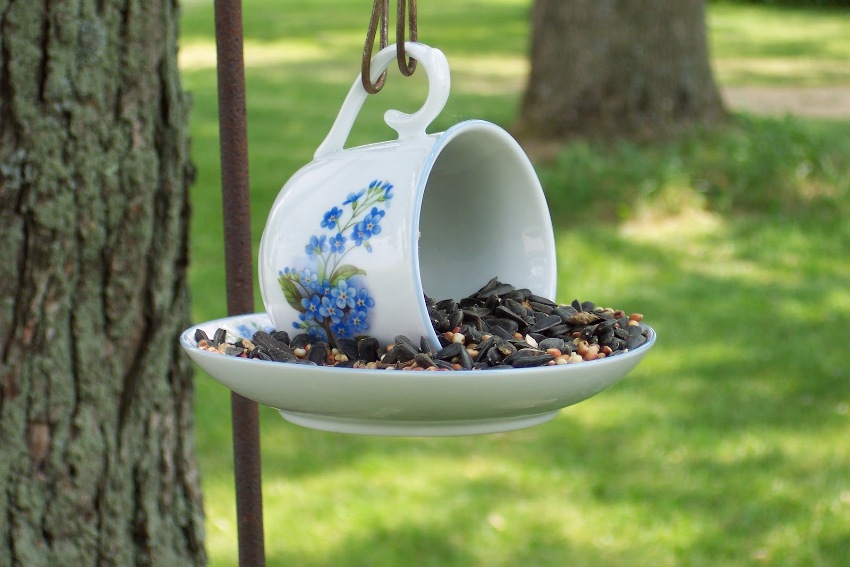 Untuk hiasan, anda boleh menggunakan perkakas lama, misalnya, piring dengan cawan atau periuk teh. Untuk melakukan ini, 4 lubang digerudi di piring dan tali ditarik melalui mereka. Selepas itu, cawan dilekatkan pada piring. Struktur sedemikian boleh digantung di mana sahaja di halaman. Ukiran, lukisan terang, kepingan kulit dan appliques kelihatan asli dalam reka bentuk pengumpan. Dengan membuat beberapa reka bentuk dengan gaya yang sama, anda boleh mendapatkan komposisi cantik yang akan menekankan bahagian luar halaman.