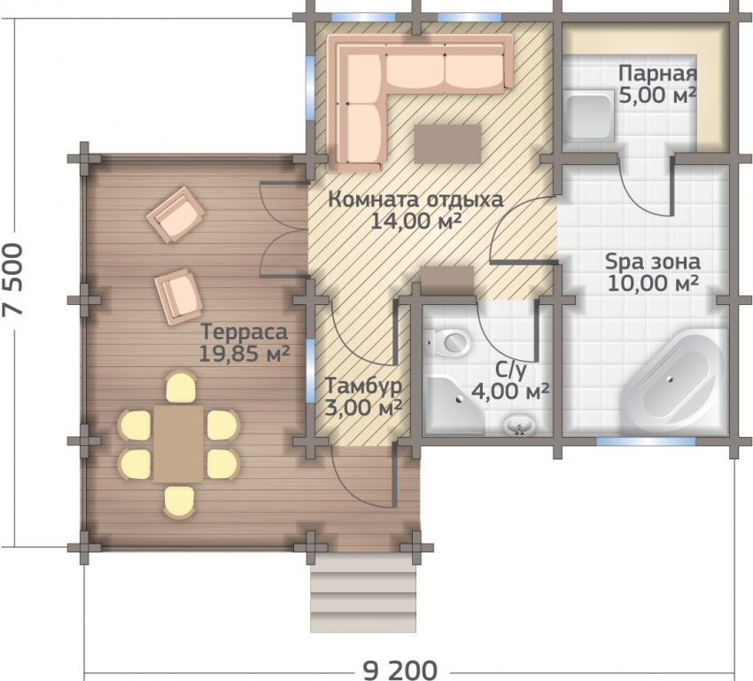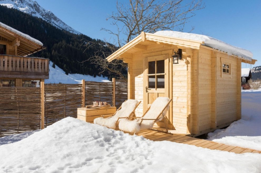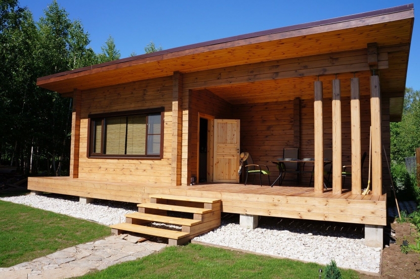Nasihat berguna! Untuk menggunakan sauna dengan teres pada musim sejuk, perlu menyediakan ruang depan di bangunan atau membuat teres ditutup sebahagiannya.