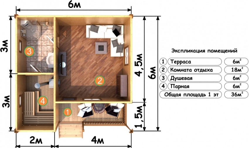 Yang paling popular adalah projek mandi yang diperbuat daripada kayu 6x6 dan 5x5 m.Biasanya ini adalah bangunan satu tingkat yang mengandungi ruang ganti, ruang berehat, bilik mandi dan bilik wap. Satu atau dua kabin boleh dipasang di bilik mandi. Bilik wap direka untuk 4-5 orang. Ruang santai boleh memuatkan sehingga 8 orang. Ini adalah penyelesaian yang baik untuk keluarga besar.