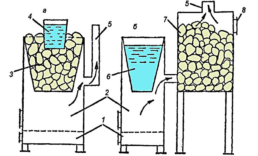 Kompor pemanas kompak untuk mandi dengan tangki air (a - pemanas berterusan; b - pemanas kumpulan): 1 - panci abu; 2 - kotak api ketuhar pencuci; 3 - tangki yang dipenuhi dengan batu; 4 - baldi air; 5 - cerobong keluar; 6 - dolar dengan air; 7 - tong berisi batu; 8 - pintu wap