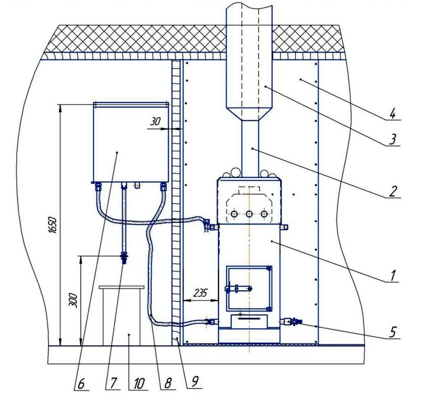 Penempatan dapur logam dan tangki air di dalam tab mandi: 1 - pemanas dapur dengan jaket pemanas air; 2 - cerobong keluli tahan karat (115 mm); 3 - pemotongan cerobong; 4 - penutup dinding yang tidak mudah terbakar; 5 - injap saliran; 6 - tangki air panas; 7 - paip analisis air panas; 8 - paip tahan panas; 9 - partition; 10 - bangku untuk lembangan