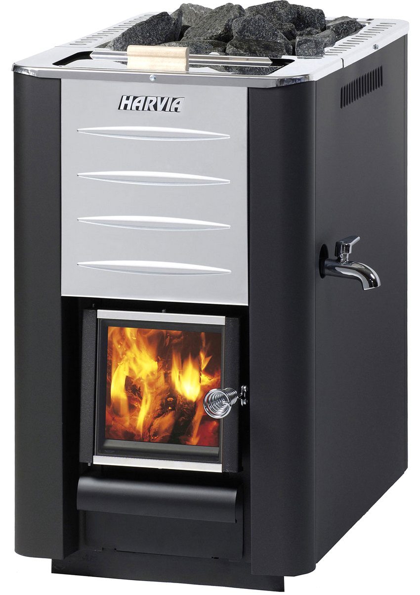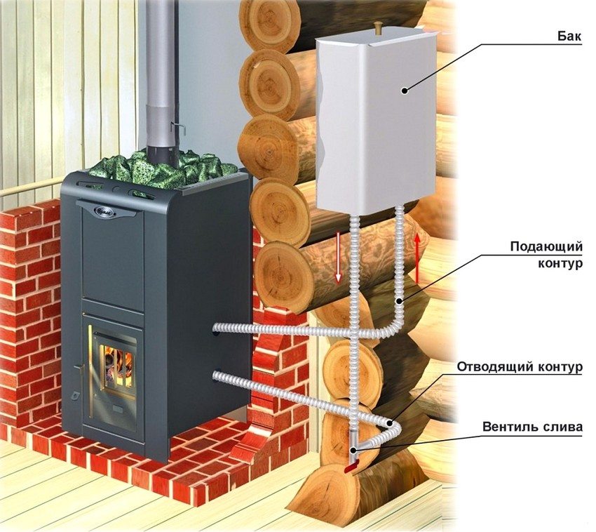 Kompor sauna kayu bakar dengan tangki air dipasang di rumah sekiranya tidak ada kemungkinan untuk menyambungkan rangkaian elektrik atau saluran paip gas. Peralatan pelbagai fungsi ini menarik pengguna dengan skim pemasangan dan ekonominya yang mudah. Tawaran pasaran menawarkan pelbagai reka bentuk dari pelbagai jenis dan tahap kuasa.