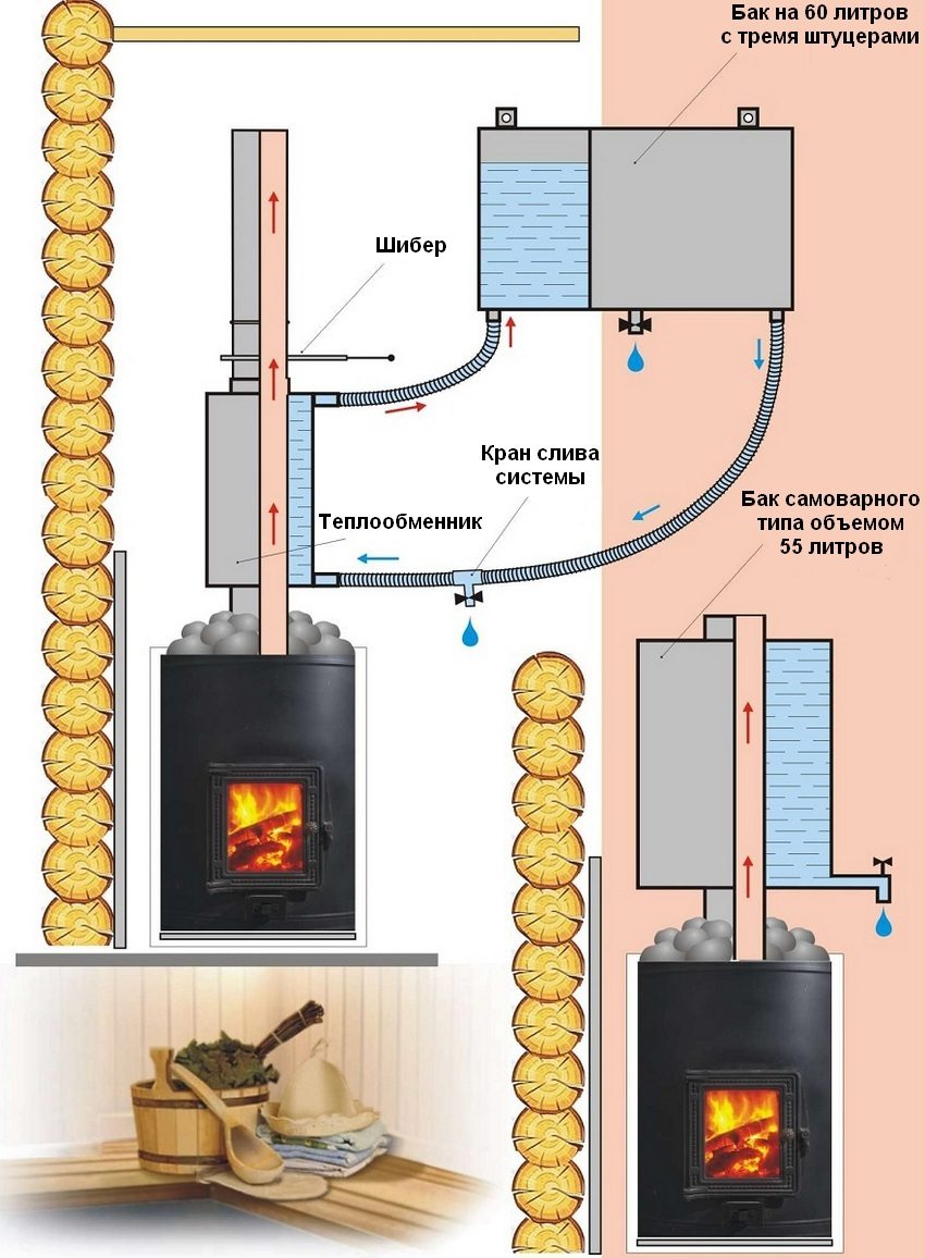Nasihat berguna! Proses pemanasan dapat diatur dalam beberapa cara sekaligus. Dibolehkan membina tangki dengan isipadu yang besar ke dalam cerobong asap, cairan di dalamnya akan dipanaskan secara langsung dari produk pembakaran kayu bakar. Adalah mungkin untuk memasang tangki kecil di cerobong, lengkap dengan dua muncung. Bekas mudah alih dengan isipadu besar dipasang pada mereka.