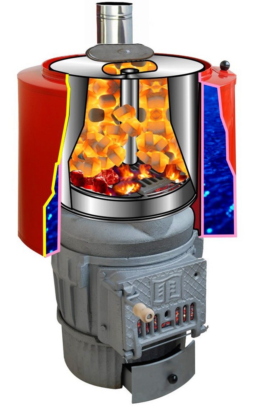 Jenis tungku besi tuang untuk mandi dengan api kayu (mengikut jenis penempatan tangki), ciri-cirinya