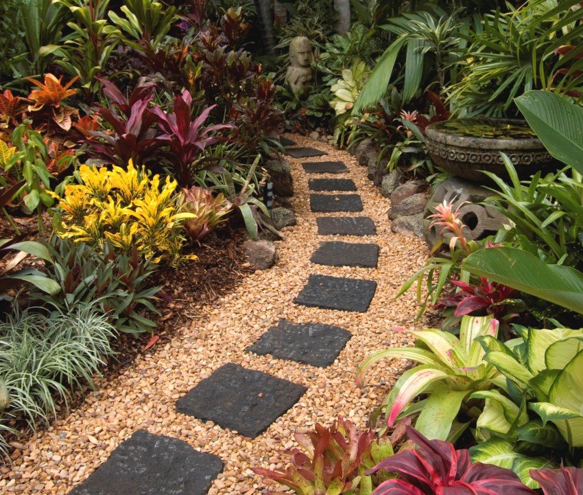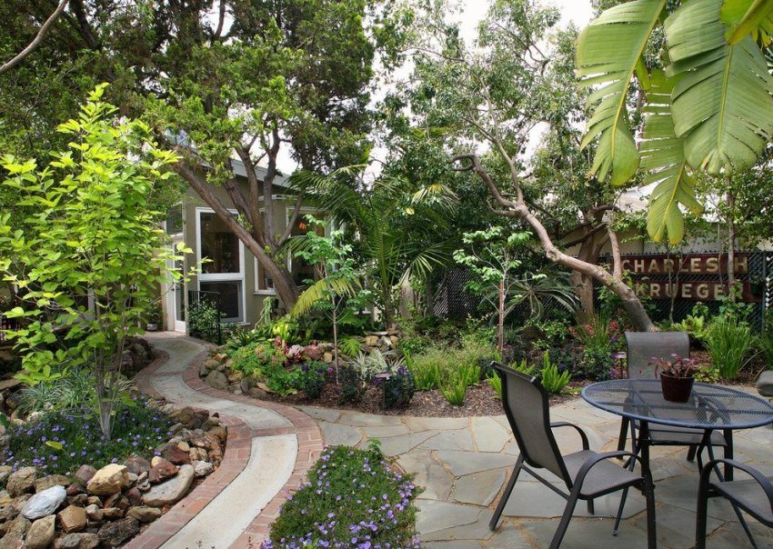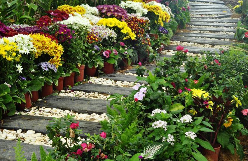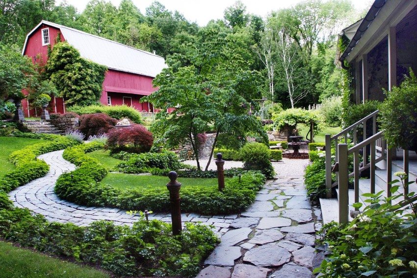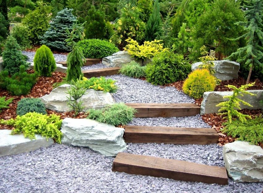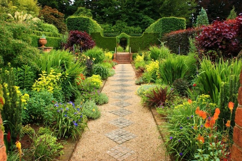 - praktikal - mewujudkan persekitaran yang selesa dan selesa di mana ia selamat. Faktor ini menjadikannya perlu untuk membina jalan di mana ia sangat diperlukan untuk pergerakan antara objek dan bangunan luar. Untuk tujuan yang sama, trek dibuat antara katil dan pokok. Pemilihan bahan bergantung pada tujuan sebenar dan kekerapan penggunaan;