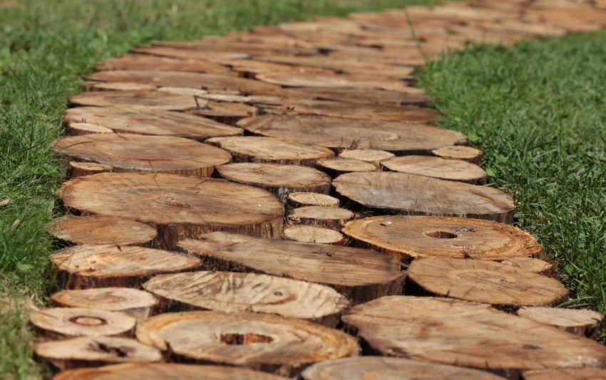 Pembinaan jalan kebun dengan tangan anda sendiri dengan kos rendah boleh dilakukan dengan menggunakan bahan yang sangat membazir. Contohnya ialah jalan yang dibuat dari potongan pokok. Untuk pembuatannya, kayu balak digergaji menjadi tunggul dengan ketinggian 10 - 15 cm. Bahan kerja dirawat dengan sebarang antiseptik sehingga dapat melayani sekurang-kurangnya 3 - 4 tahun.