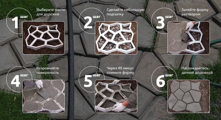 Untuk membuat trek yang indah dan moden, cukup memasang satu atau beberapa acuan dalam satu baris dan mengisinya dengan penyelesaian. Selepas beberapa jam, acuan digerakkan lebih jauh dan bahagian seterusnya dituangkan. Laluan yang dibina dengan cara yang asli dan mudah kelihatan begitu rapi, seolah-olah dibuat dari jubin seramik yang mahal, jika anda menambahkan pewarna pada komposisi.