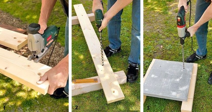 Gambar: 1-2. Prosedur untuk membuat bangku taman dari papak kayu dan konkrit: 1 - penyediaan bahagian kayu; 2 - menandakan papan, lubang penggerudian di dalamnya; 3 - menandakan papak konkrit, lubang penggerudian pada papak