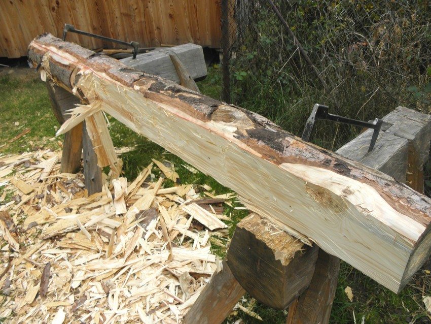 - setelah memotong log masuk dua, permukaan bahagian yang dihasilkan harus diratakan di tempat pemotongan sehingga satah rata diperoleh. Penyelewengan dikeluarkan dengan berhati-hati dengan gergaji besi;