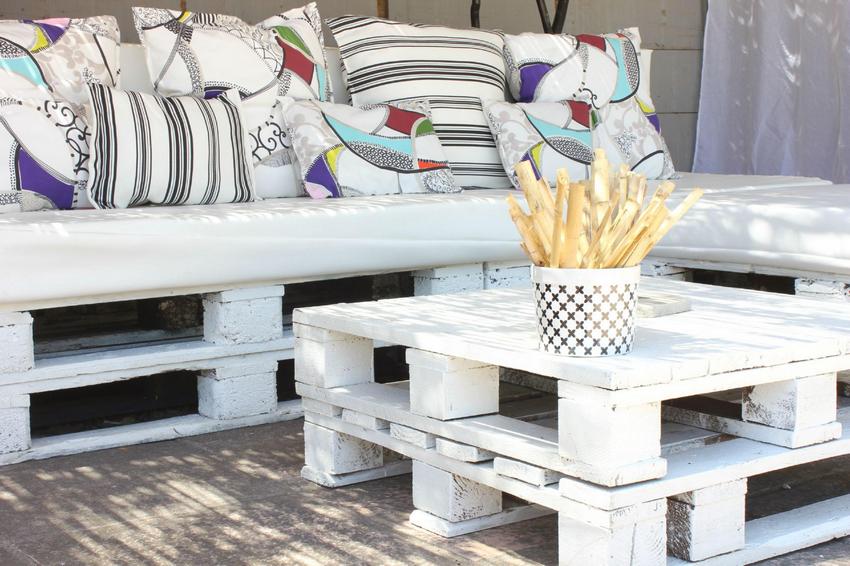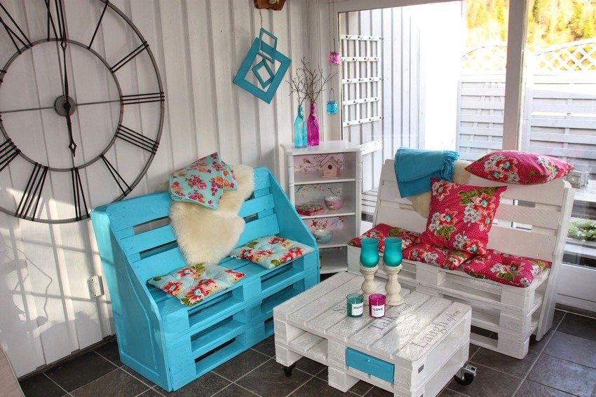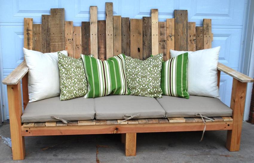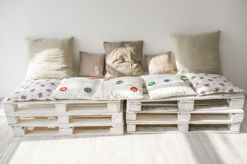 Versi produk yang paling mudah dibuat berdasarkan dua palet yang dipasang satu sama lain pada sudut yang betul. Akibatnya, palet bawah akan menjadi tempat duduk, dan palet atas dapat digunakan sebagai sandaran. Palet boleh dipangkas sedikit untuk menjadikan struktur lebih kemas dan harmoni. Fiksasi dilakukan dengan menggunakan pemutar skru dan skru mengetuk sendiri.